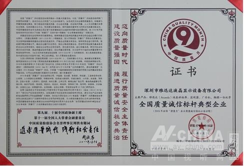 而在這樣一個(gè)全國(guó)質(zhì)量月的特殊時(shí)期,雅迅達(dá)被中國(guó)質(zhì)量檢驗(yàn)協(xié)會(huì)評(píng)為“全國(guó)質(zhì)量誠(chéng)信標(biāo)桿典型企業(yè)”,以液晶拼接屏、液晶監(jiān)視器為代表的產(chǎn)品被評(píng)為“全國(guó)質(zhì)量檢驗(yàn)穩(wěn)定合格產(chǎn)品”,尤其顯得意義重大。這不僅是一份沉甸甸的榮譽(yù),而且也是中國(guó)質(zhì)量檢驗(yàn)協(xié)會(huì)和廣大用戶對(duì)雅迅達(dá)及其產(chǎn)品的堅(jiān)定信任和積極支持。雅迅達(dá)人也將以此自勉,在品質(zhì)誠(chéng)信的道路上越走越好。