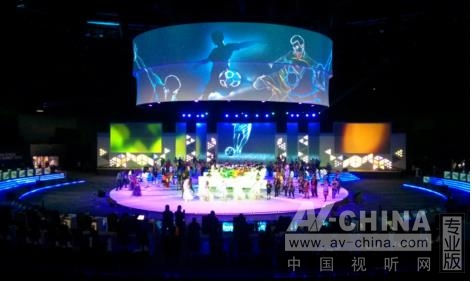 組辦方委派Modern Stage Service為大會(huì)打造投影燈光映射,投影區(qū)域包括直徑21.3米的圓形主地面的中央、兩個(gè)直徑分別為20.7米和20.1米的懸掛式大型圓柱形屏幕,以及由多個(gè)大小不同的屏幕構(gòu)成的舞臺(tái)背景。