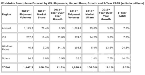 而根據(jù)IDC提供的最新數(shù)據(jù),全球智能手機市場規(guī)模從現(xiàn)在到2019年,年復(fù)合增長率僅為8%左右。
