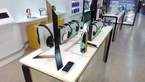 店鋪的布局也遵循了同樣的創(chuàng)意。我們把產(chǎn)品體驗(yàn)放在中心區(qū)域,四周的墻面作為陳列。“旅行家的選擇”用來重點(diǎn)突出適合旅行的產(chǎn)品。黑色與金色融合的金屬絲帶挑戰(zhàn)了任何現(xiàn)存的聲音產(chǎn)品展示方式。意在用輕盈的展示表達(dá)未來感。