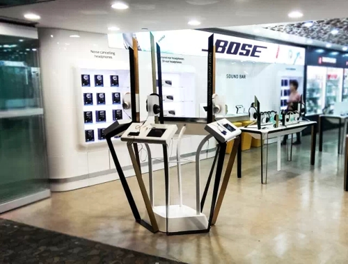 BOSE 邀請Overlay 為他們構(gòu)思在浦東機(jī)場的新店。在這個(gè)上海最大的國際機(jī)場,我們用科幻電影的太空飛船作為靈感。全封閉的圓角墻面背板發(fā)光,創(chuàng)造一個(gè)非常明亮抓人眼球的設(shè)計(jì)來吸引任何走過的顧客來體驗(yàn)BOSE的產(chǎn)品。