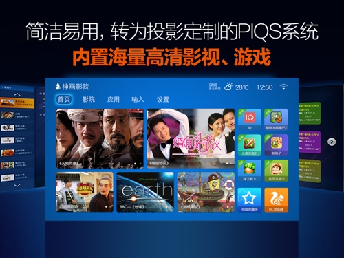 下面我們?cè)賮砹私庖幌聯(lián)碛?00色彩流明值的神畫Y1智能3D投影儀。這款擁有雙鏡頭的3D智能家庭影院配備了包括2秒自動(dòng)對(duì)焦、200吋巨幕投射能力、搭載安卓智能操作系統(tǒng)、配備高性能四核A9處理器、虛擬觸摸遙控器、3D硬件解碼、無線同屏/視頻和PIQS pad版UI八大特色。