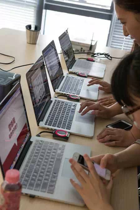 將可立享的四個按鈕同時連接四臺電腦時,它可以實現(xiàn)投影屏幕的四分屏演示。(圖為三分屏演示效果)。并且,可立享會根據(jù)每臺電腦的分辨率進行智能優(yōu)化,通過選擇最佳的顯示比例來進行投影,不會強制拉伸電腦畫面造成顯示內(nèi)容變形。
