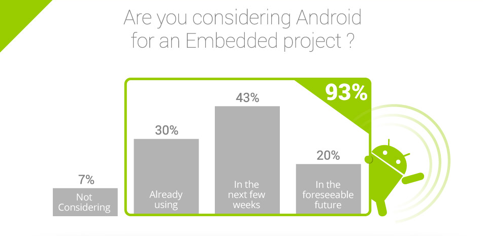 調(diào)查結(jié)果顯示,93%的受訪者表示會考慮在嵌入式服務(wù)中使用Android系統(tǒng)。其中30%的受訪者正在使用嵌入式Android系統(tǒng),43%的受訪者表示會在未來幾周投入使用。
