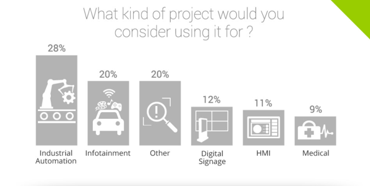 近50%的受訪者認為,嵌入式Android系統(tǒng)主要適用于工業(yè)自動化和車載娛樂系統(tǒng)中。 而數(shù)字標牌、人機互動和醫(yī)療也被認為是嵌入式Android系統(tǒng)的重要應(yīng)用方向。