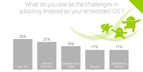 受訪者認為適應(yīng)觸屏界面、縮短上市時間和產(chǎn)品易于客制化是嵌入式Android的主要優(yōu)勢。觸屏界面為嵌入式控制臺應(yīng)用等操作提供了便利,也為企業(yè)向工業(yè)4.0的轉(zhuǎn)型提供了基礎(chǔ)。同時,開源的Android系統(tǒng)大大方便了開發(fā)者對系統(tǒng)進行客制化調(diào)整和升級,縮短上市時間。