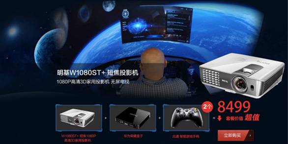 自即日起明基W1080ST+將于京東商城展開(kāi)限時(shí)大促,原價(jià)8799特價(jià)8499!除直降300以享玩家外,再額外放送兩重好禮,分別為價(jià)值298的華為榮耀智能電視機(jī)頂盒(真4K超高清/H.265硬解碼/300M全向雙天線設(shè)計(jì)/接入廣電總局授權(quán)播控平臺(tái)/正版內(nèi)容合法提供),以及同樣價(jià)值298的2個(gè)北通阿修羅TE智能游戲手柄(鏡面黑酷外觀/2.4G無(wú)線連接/支持PC、PS3多種游戲平臺(tái)和智能系統(tǒng))。一臺(tái)游戲短焦投影機(jī)外加智能盒子2個(gè)手柄,讓你玩樂(lè)之余再享無(wú)屏電視和海量電影。