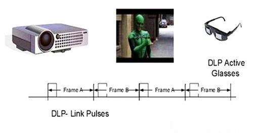 說白了DLP Link只是一個在左右眼對應(yīng)畫面間加入脈沖同步信號的技術(shù)。120Hz刷新率下,每1/120秒顯示完一副左眼或者右眼對應(yīng)的畫面之后,緊跟著DLP芯片會發(fā)出一個白峰脈沖,3D眼鏡前端的光敏元件感受到這一脈沖,便進行左右鏡片的液晶光閥交替開閉動作,從而完成同步動作。