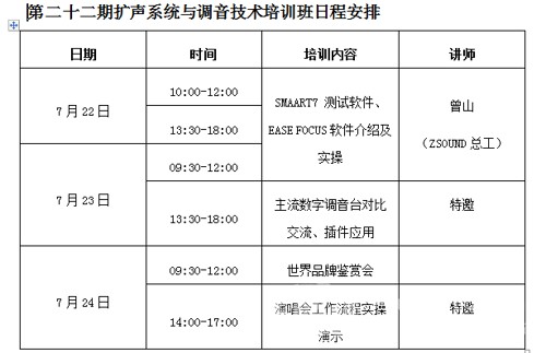 ZSOUND聯(lián)合深圳聚圳空間(ZSOUND演出聯(lián)盟單位),定于2015年7月22日至24日舉辦第二十二期擴(kuò)聲系統(tǒng)與調(diào)音技術(shù)培訓(xùn)班。本次培訓(xùn)班人數(shù)約80人,為保證授課質(zhì)量,報(bào)名名額超過80人即截止報(bào)名。