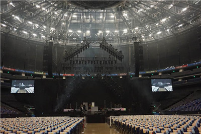 4月21日和22日的兩場演出使用Meyer Sound大型擴(kuò)聲線性陣列LEO系統(tǒng),由每邊14只LEO-M、2只LYON-W和2只LYON-M共36只揚(yáng)聲器組成主擴(kuò)聲系統(tǒng),每邊12只1100-LFC低頻控制單元作為主系統(tǒng)的低頻系統(tǒng)。側(cè)方補(bǔ)聲系統(tǒng)由每邊11只LYON-M和1只LYON-W揚(yáng)聲器組成。8只MINA揚(yáng)聲器負(fù)責(zé)前排補(bǔ)聲,地面低音組由16只1100-LFC組成,14只MJF-212A用于舞臺(tái)監(jiān)聽。整套系統(tǒng)由1臺(tái)Galileo 616 AES和4臺(tái)Galileo Callisto 616揚(yáng)聲器管理系統(tǒng)驅(qū)動(dòng)和優(yōu)化。