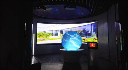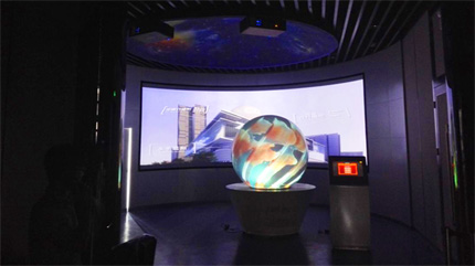 它打破了以往投影圖像只能是平面規(guī)則圖形的局限,利用特殊的光學(xué)鏡頭,將普通的平面影像進(jìn)行特殊的變換,投射到一個(gè)球形的屏幕內(nèi),形成一個(gè)內(nèi)投的球體影像。內(nèi)投球采用高流明的投影機(jī),高分辨率技術(shù)可以播放各種經(jīng)過(guò)視頻變幻的影像,使整個(gè)球體看起來(lái)就像一個(gè)科幻的大球,可以很好的吸引參觀者的眼球,該產(chǎn)品主要應(yīng)用于科普教育、展覽展示、廣告娛樂(lè)和虛擬仿真等領(lǐng)域。本球幕通過(guò)3臺(tái)視美樂(lè)SML-PF500工程投影機(jī)采用多機(jī)疊加,實(shí)現(xiàn)亮度提高,圖像無(wú)損的顯示效果。將球幕亮度提高三倍,完美解決現(xiàn)場(chǎng)環(huán)境光過(guò)高的缺憾。