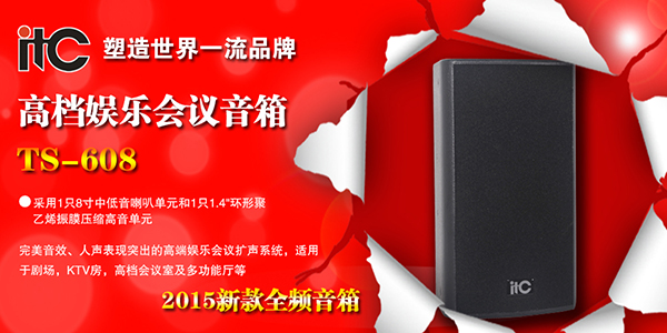 【ITC新品推薦】2015新款全頻音箱-炫黑高檔娛樂會議音箱-TS-608, 與TS專業(yè)功放、前級效果處理器配套使用,組成一套完美音效、人聲表現(xiàn)突出的高端娛樂會議擴聲系統(tǒng),適用于劇場,KTV房,高檔會議室及多功能廳等,與超低音搭配可做高性能衛(wèi)星箱使用。