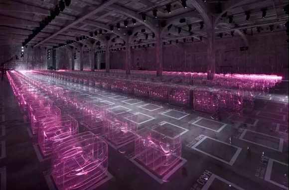 當(dāng)上方的白光燈將光線集中打在舞臺(tái)上時(shí),雪花型的小斑點(diǎn)就開始飄落在時(shí)裝行走道周圍。音頻配樂響起,增加整體氛圍—混合音樂來自于知名小說改編電影《銀翼殺手》和《星際》中的配樂,讓個(gè)環(huán)境因?yàn)榍把貢r(shí)尚人物而充滿了超現(xiàn)實(shí)的反烏托邦感。