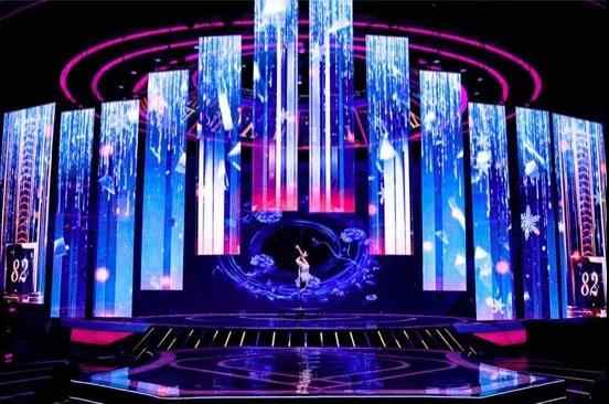 舞美影像通過(guò)背景LED大屏和兩邊側(cè)屏、錯(cuò)落條形屏等成像載體表現(xiàn)。舞臺(tái)視覺(jué)設(shè)計(jì)通過(guò)多屏配合形成完整的場(chǎng)景,虛實(shí)交織的呈現(xiàn)烘托歌曲節(jié)奏、意境。