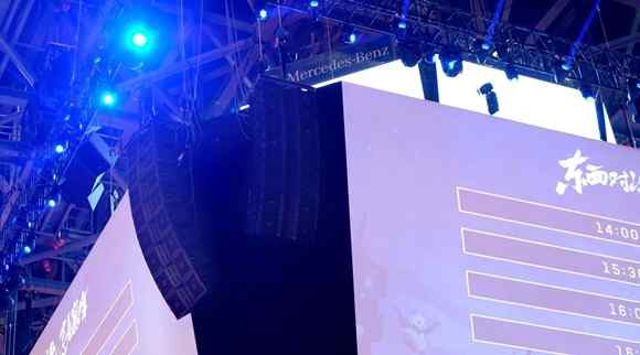 主擴(kuò)聲系統(tǒng)采用8組JBL雙15寸線陣列揚(yáng)聲器,包括32只VTX V25II和32只VT4889均勻環(huán)繞著四面舞臺(tái),地面擺放16只VTX G28雙18寸超低音揚(yáng)聲器;前區(qū)補(bǔ)聲使用6只同為VTX系列的V20線陣列揚(yáng)聲器,舞臺(tái)上使用8只F15供樂隊(duì)返聽使用。全套系統(tǒng)都配套使用Crown IT-HD功放系統(tǒng)。
