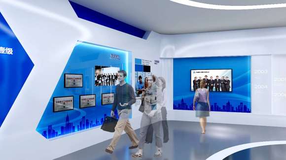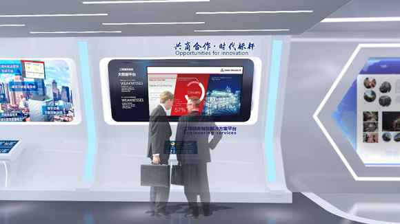 展廳的序廳在入口處一面大型弧面LED屏幕形象墻搭配天花軟膜建造成的藍(lán)天白云將展廳的氛圍提升到一種全新的舒適的并且符合企業(yè)文化的新層面,智能機(jī)器人“小鋁”會(huì)在序廳的位置等候參觀者并講解展廳內(nèi)相關(guān)的內(nèi)容和事宜。