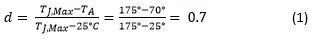 SOA using Equation 1:假定環(huán)境溫度為25˚C,與在數(shù)據(jù)表上測(cè)量SOA的情況相同。由于最終應(yīng)用可能暴露于更熱的環(huán)境中,所以必須按照環(huán)境溫度與FET最大結(jié)溫之比,按比例為SOA降額。例如,最終系統(tǒng)的最高環(huán)境溫度是70˚C,可以使用公式1為SOA曲線降額: