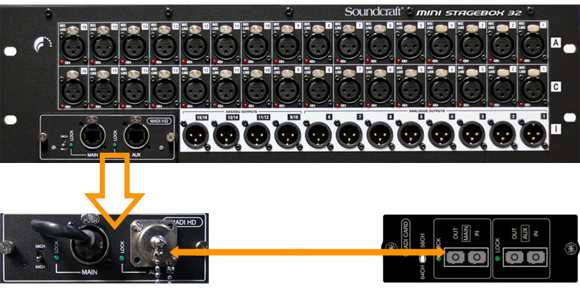 如果添加第二個MADI擴(kuò)展卡就能夠同時連接兩個Soundcraft迷你舞臺接口箱(32R、32i或16R、16i),最多可獲得96個話放。