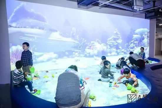 一群孩子們聚集在“探索”主題區(qū)正玩得開心,隨著孩子們揮動鏟子,VR投影在沙灘上的寶箱漸漸顯露出來,孩子們不時發(fā)出歡呼。在墻壁的AR投影中有小魚、海星、貝殼、螃蟹等海底生物在游動,小朋友可以將自己繪制的彩色魚兒通過AR掃描,放入投影墻體當中,體驗親手創(chuàng)造的樂趣。