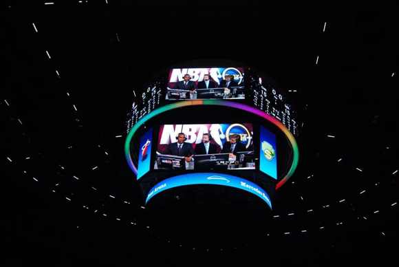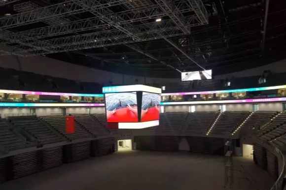 在體育館中央上方的LED斗型屏采用四面圍繞的環(huán)形設(shè)計(jì),猶如巨大的星幕,散發(fā)出耀眼的光芒,由上海三思設(shè)計(jì)制造完成。四塊LED屏每塊屏幕高4米,寬7米,總面積為112㎡,四面環(huán)繞。