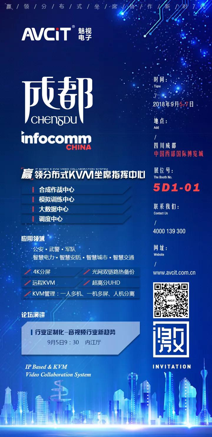 2018年9月5日—7日,AVCiT魅視將攜極具前瞻引領的產品技術和創(chuàng)新應用解決方案,誠意亮相『首屆成都Infocomm China』——中國西部,一帶一路,機遇無限,價值共享!
