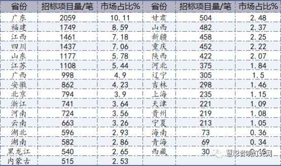 上半年全國各省音響設(shè)備市場公開采購項目量排名前三的是:廣東、福建、江西,三省的項目采購量占全國總項目量的25.88%。