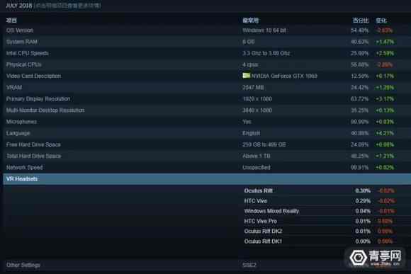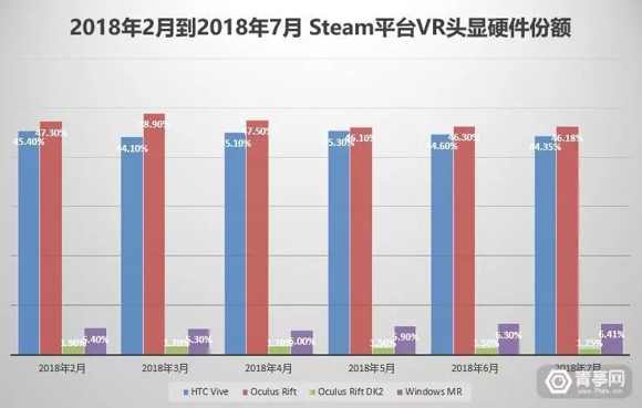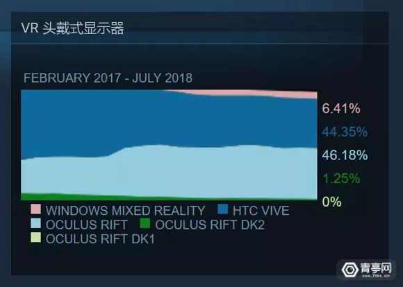 2018年7月,VR用戶在整個(gè)Steam用戶中的占比從上個(gè)月的0.7%再次拉低至0.65%。其中Oculus Rift活躍用戶占比為0.30%(較上月下降0.02%),HTC vive為0.29%(較上月下降0.02%),Windows MR也占得0.04%(較上月下降0.01%),Oculus Rift DK2占比0.01%,Vive Pro占比0.01%。