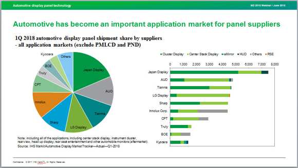 因天馬大力加持,中國大陸面板廠商在車載顯示市場的地位也在不斷提升。IHS數(shù)據(jù)顯示,中國大陸面板品牌從過去不到5%的市場份額上升到2018年第一季度的19%。