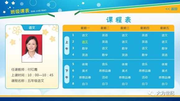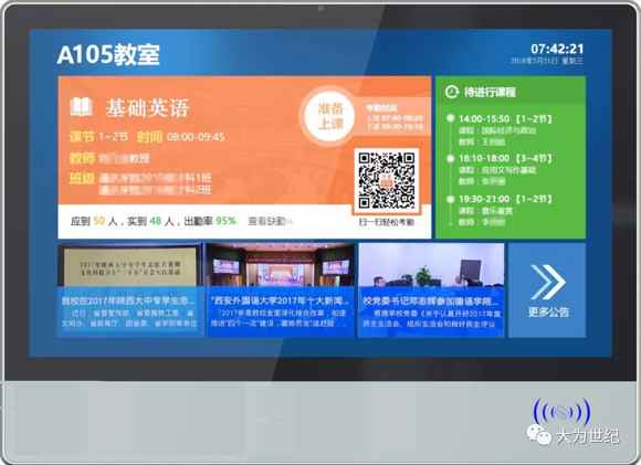 電子班牌除了是班級(jí)文化建設(shè)和展示的重要載體,也是智慧教室組成的重要部分。從功能角度講,又可以分為電子班牌、智慧班牌和云班牌,隨著功能性的進(jìn)化,電子班牌所擁有的價(jià)值越來越高。以大為世紀(jì)推出的電子班牌為例,它已經(jīng)脫離了展示的象征意義,而是形成了一套完善的系統(tǒng)。
