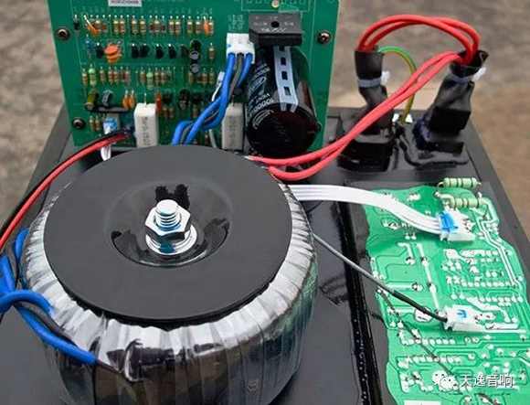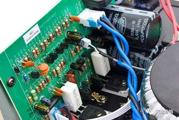 電路方面,以國產(chǎn)天逸的SUB-12TD低音炮為例:該低音炮輸入部分設(shè)計了一系列高通通和低截濾波器,其中分為:一級性能優(yōu)異的低噪聲恒流源和電子穩(wěn)壓的差分電壓放大電路、一級電流放大電路、末級高效率的大電流甲乙類推挽功放電路等。功放最末級增加了一級由Q12/Q15擔(dān)綱的電流放大擴(kuò)充電路去推動達(dá)林頓功率放大,推挽電路上下臂共4只15A/150W的2SC5200/2SA1943東芝大功率管,配合超大的鋁合金外露式梳狀散熱器,以確保該電路在4歐時有350W的充足功率輸出。相信這樣大的功率儲備,足以滿足一只優(yōu)秀低音炮的嚴(yán)格功率要求!在充分保證主體功放電路優(yōu)秀的同時,該電路還設(shè)計了一系列過流、過壓、過熱等保護(hù)電路,以保證該低音炮正常工作時的可靠性。開箱可見:在選擇電阻電容時,所有的電阻均選用優(yōu)質(zhì)五色環(huán)金屬膜電阻。在可能影響音質(zhì)的主要通道和電源濾波部份,分別選用了音質(zhì)好、可靠性高的音頻專用電容和倍受青睞、容量高達(dá)20000微法的日本紅寶石音響專用電解或MARCOM優(yōu)質(zhì)音頻專用電解大水塘;右側(cè)一只400VA的巨型變壓器十分醒目,為整機(jī)提供了充沛的動力保障!