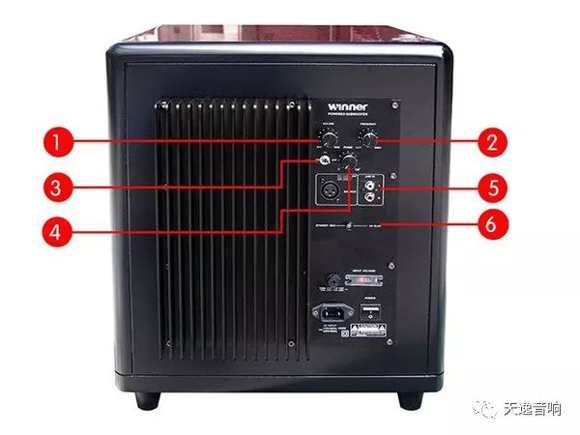 ❺第三排是兩個輸入低音信號的接口,左邊為專業(yè)級別的平衡輸入端,右邊為普通的蓮花端子輸入口,對應(yīng)于AV功放的低音炮輸出端子連接即可。