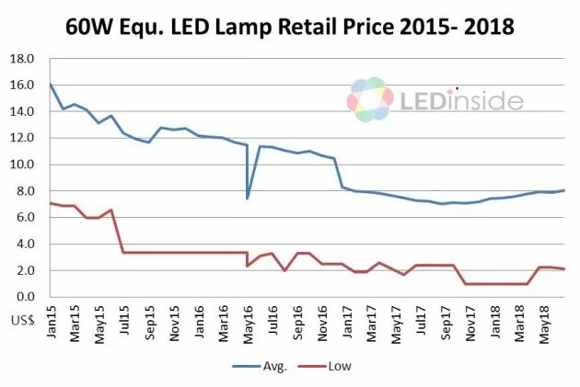 LEDinside自LED照明市場(chǎng)發(fā)展之初即開始追蹤市場(chǎng)價(jià)格信息,根據(jù)LEDinside的歷史數(shù)據(jù),以一顆相當(dāng)于60瓦的LED燈泡價(jià)格來(lái)看,此價(jià)格在2011年一月時(shí)約45-50美元一顆,到了2018年七月,價(jià)格卻已經(jīng)下滑至不到10美元。