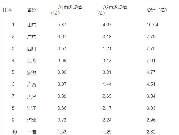 2018年上半年,我國城市智能交通千萬項(xiàng)目市場主要集中在我國華東地區(qū)(如圖2所示)。市場區(qū)域排在前十的省及直轄市依次包括山東、廣東、四川、江蘇、安徽、廣西、天津、浙江、河北、上海,其中華東地區(qū)就有5個省及直轄市入榜,前十市場區(qū)域中華東地區(qū)市場總計(jì)千萬項(xiàng)目數(shù)185項(xiàng),市場規(guī)?傆(jì)約28億,約占2018年上半年我國城市智能交通千萬項(xiàng)目市場規(guī)模的35.4%。
