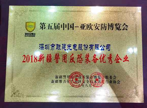 展會期間,聯(lián)建光電斬獲2018新疆警用反恐裝備優(yōu)秀企業(yè)獎(jiǎng)。
