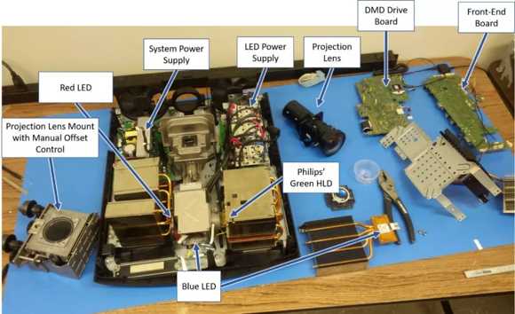 李俐表示:飛利浦投影事業(yè)部走LED光源這條路線,主要原因是LED的色彩表現(xiàn)好。我們投入了大量的研發(fā)經(jīng)費(fèi),HLD并不是對(duì)LED簡(jiǎn)單的改造,而是全新的創(chuàng)新,相較于原來(lái)的LED芯片,HLD模組最大的優(yōu)勢(shì)就是亮度的大幅提升。HLD的核心技術(shù)是芯片里的光棒,光棒里面按照一定的化學(xué)工藝填充了轉(zhuǎn)換的化學(xué)物質(zhì),光棒上下兩面貼上藍(lán)色的LED芯片,發(fā)出藍(lán)色光并投射到光棒上,再轉(zhuǎn)換成綠、黃、紅等各種需要的顏色光進(jìn)行收光,這種架構(gòu)的好處就是實(shí)現(xiàn)了亮度的急劇提升。光源亮度這個(gè)技術(shù)門檻的突破,讓品牌廠商看到了機(jī)會(huì)。
