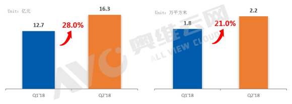 2018年H1中國(guó)小間距LED國(guó)內(nèi)市場(chǎng)銷售額和銷售面積及其環(huán)比