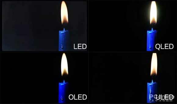 從圖片中明顯可以看出,OLED屏幕顯示黑色背景十分純粹,用LED背光源的LCD電視,背景則顯得灰白,不夠純粹,QLED屏幕在蠟燭火焰處不夠干凈純粹,ULED雖然處理得很好,但在藍(lán)色蠟燭上顯示還是不如OLED。