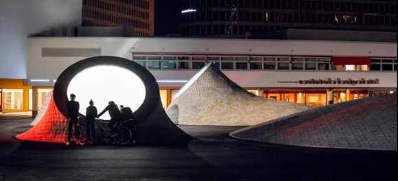 《光粒子的渦旋》中的水滴由連續(xù)的許多水顆粒表示,并計(jì)算顆粒之間的相互作用,繪制出水粒子的流動(dòng)行成水流線。這被認(rèn)為是超主觀空間的線條“展平”線條。水的運(yùn)動(dòng)取決于博物館的形狀以及將水拉到天窗和地面廣場的力。