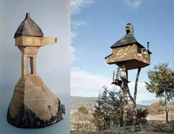 圖中的樹上茶室,是被稱為日本建筑界“老頑童”藤森照信(也是本次展覽的策展人)為自己修建的樹上茶室“高過庵”,被美國時代周刊評選為“世界上10大最危險的建筑”。不過現(xiàn)在,觀眾不需要冒險,就可以假裝在里面喝茶了。