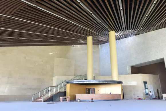 走進大劇院,內(nèi)部裝修已經(jīng)基本完成。明亮的大理石地面,鑲嵌了眾多壁燈的走廊,給人極大氣的感覺。“整個大劇院地上有四層,地下有三層,總高59.65米。”工作人員介紹,隨著裝修工作進入尾聲,大劇院投用的日期越來越近。