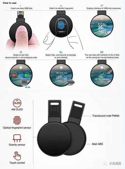這款名為One-Step的智能U盤是針對人們拷貝資料時內(nèi)存不足,無意丟失U盤導致信息泄露等問題,通過將現(xiàn)有的重力傳感器,屏下指紋識別,OLED等技術與Shake、Hold、Touch手勢相結合,做到內(nèi)存顯示只需隨時一搖,指紋解鎖只需隨手一按,文件快速打印與轉(zhuǎn)移只需隨心一觸。One-step智能U盤提供的整合性解決方案,為用戶帶來全新有趣,前瞻性的交互體驗。 設計:Xingxu Chen,Prof.Shaoping Guan&Jing Yang