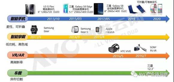 在手機OLED應(yīng)用上,手機OLED屏幕由16:9到18:9,由Curve到Foldable再到Rollable,隨消費者需求,變化明顯;在智能穿戴上面,由于OLED技術(shù)低功耗、高色域的顯示特性,AMOLED及PMOLED技術(shù)基本占據(jù)穿戴顯示技術(shù)八成以上的份額;在VR/AR虛擬顯示上面,由于OLED高刷新率的顯示特性,隨著VR/AR市場的逐步成熟,OLED技術(shù)的應(yīng)用也將逐步增長;另外,由于車載顯示對屏幕外形有著特殊需求,如異形切割、環(huán)駕駛艙顯示等趨勢,也為OLED帶來機會;綜上所述,OLED技術(shù)的顯示特性決定OLED不僅僅應(yīng)用于智能手機,仍將廣泛應(yīng)用于穿戴、VR/AR、車載等市場帶來機會。