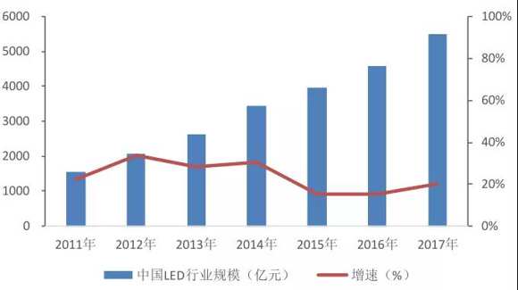 數(shù)據(jù)顯示:2011年以來,中國LED市場規(guī)模快速增長,從2011年的1540億元成長到2017年LED市場規(guī)模達(dá)到5509億元,復(fù)合增速達(dá)23.7%。