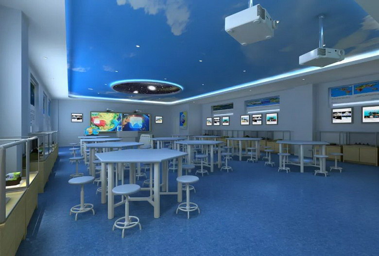 在羿飛地理專用教室,教師通常運(yùn)用教室后方的巨大投影屏幕即環(huán)幕示教系統(tǒng)和天花板上的天文演示穹頂播放課程相關(guān)視頻,在課程中穿插使用,幫助學(xué)生加深理解。