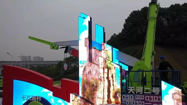 由明和獨(dú)立研制的彩車高清LED顯示屏,每個(gè)異形模塊都采用特殊定制開發(fā)而成,實(shí)現(xiàn)了高精度無(wú)縫拼接效果,與不規(guī)則的車體造型達(dá)到完美契合。三湘四水的風(fēng)貌通過LED顯示屏動(dòng)態(tài)載體,形成一幅幅流動(dòng)的畫卷,是彩車之上最為靈動(dòng)的視覺亮點(diǎn)所在。由于顯示屏結(jié)構(gòu)復(fù)雜且最高高度達(dá)到10m,考慮彩車整體荷載要求,同時(shí)為了杜絕高度過高可能存在的安全隱患,選用強(qiáng)度高、重量輕、安全牢固的航空鋁型材作為主要承重結(jié)構(gòu)件,兼顧重量與安全的雙重要求。