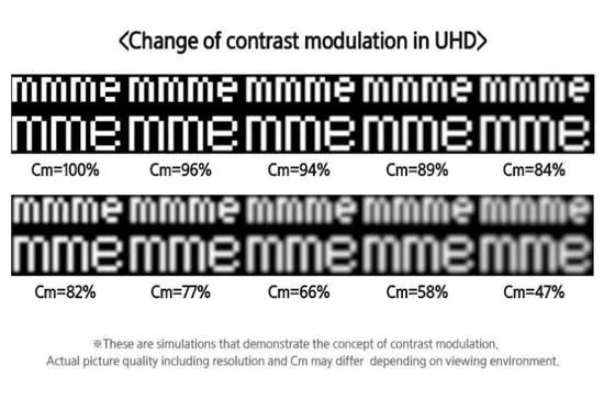 8K電視因橫向有接近8000個像素點而得名,分辨率是傳統(tǒng)4K電視的4倍。按照ICDM的規(guī)定,8K電視的CM也必須超過50%,而這也正是LG電子質(zhì)疑三星電子的主要依據(jù),他們認為8K分辨率不僅必須要有3300萬像素--7680×4320像素的結(jié)果,而且必須要擁有超50%的CM,三星實際上是在欺騙消費者。