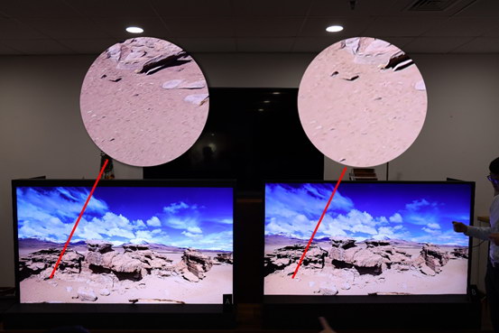 此外,在畫面中間最亮的區(qū)域,右側(cè)電視完全過曝顯得很亮,左側(cè)電視則能看清楚高亮區(qū)域中的畫面細節(jié)。