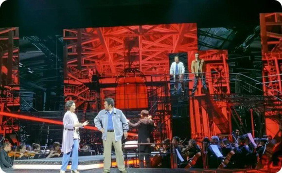 在舞美設計方面:舞臺整體呈圓形,樂隊在舞臺中間,包圍樂隊的是一個弧形,弧形前驅是一個斜坡的通道,兩邊上去后是一個高的平臺,為合唱隊提供了演出空間及高支點,同時也是戲劇表演的空間。中區(qū)有一個貫穿平臺,是角色演員的特殊通道。視覺上非常重要,在大的結構里再把其他的通道進行連接,提供了非常豐富的表演空間,上下錯落,前后穿插。