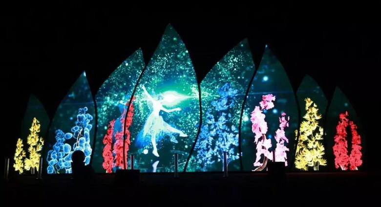 仙子裙擺如流瀑傾瀉,三維投射絢麗花海燈光,光影在曼妙的裙擺下迂回。