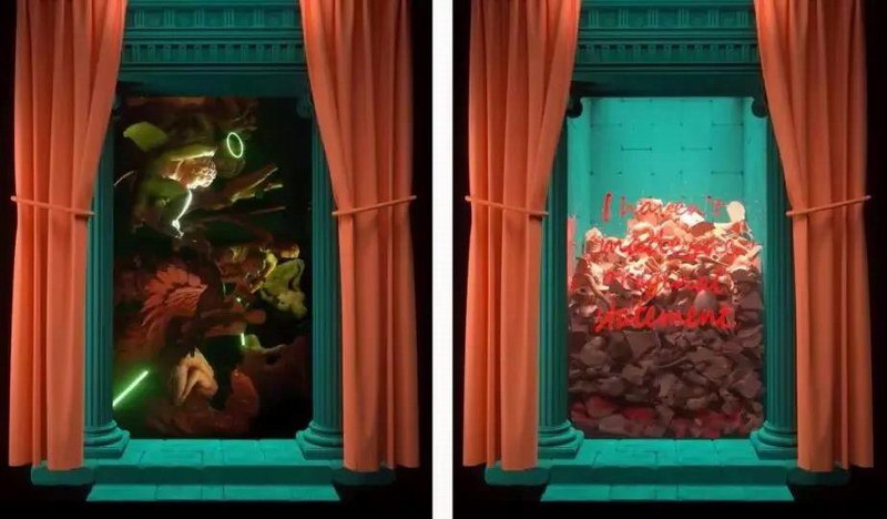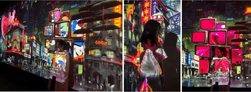 使用投影儀和紅外捕捉設(shè)備,打造的沉浸式交互影像空間。為了揭示在光怪陸離的現(xiàn)實(shí)里,不同的人設(shè)與欲望是如何在每個(gè)人身上所展現(xiàn)、隱藏、撕裂的。